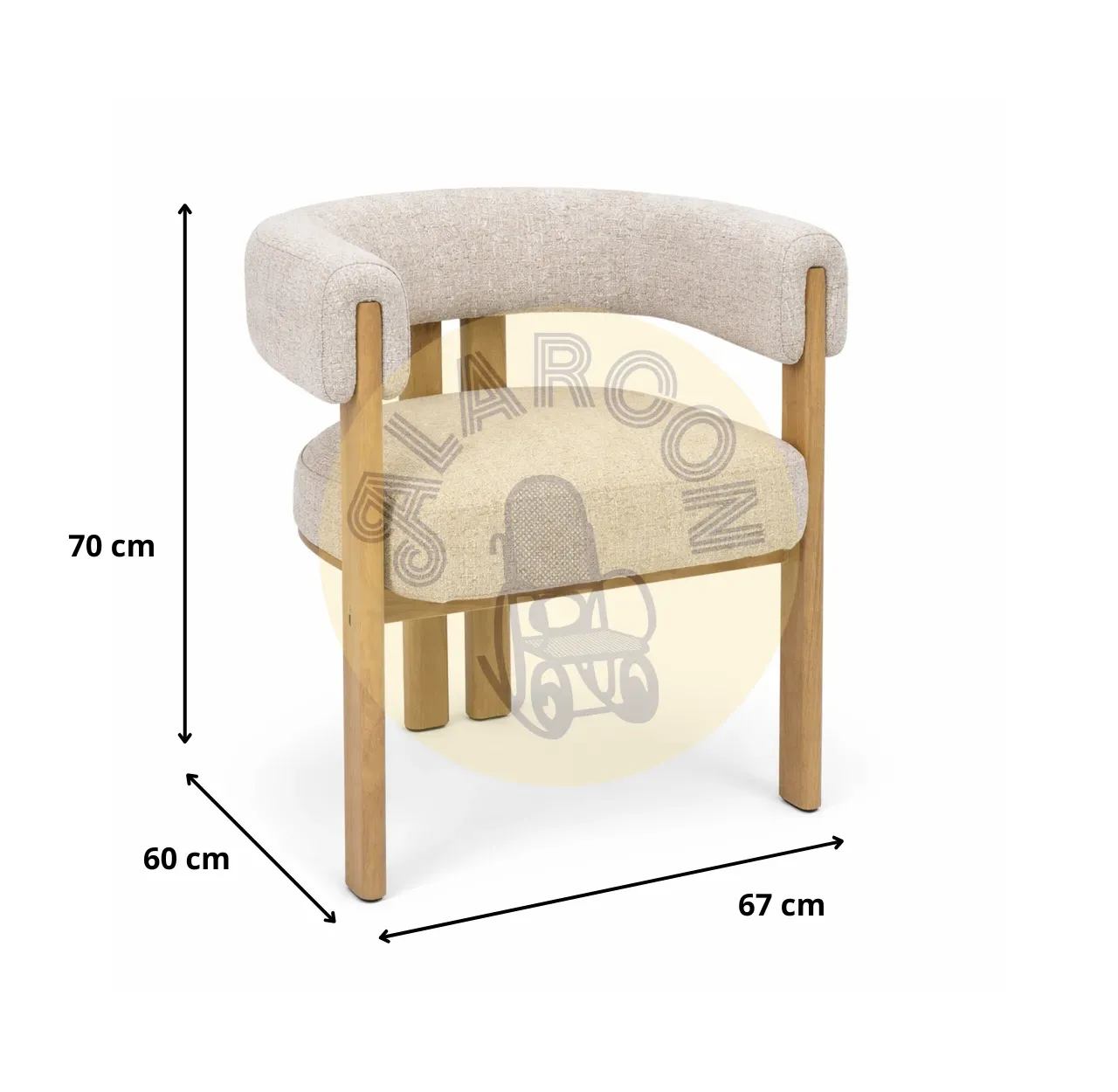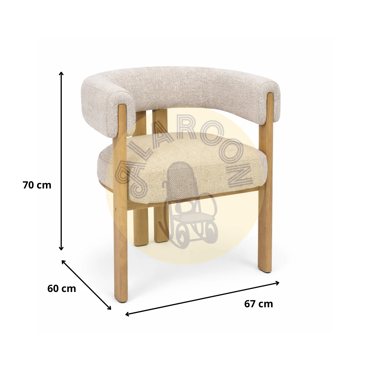 Fabricado en poliéster de tacto agradable y estructura de metal, ofrece una sentada cómoda y estable pensada para el uso diario. Sus proporciones están optimizadas para el confort, con unas dimensiones de 67×60×70 cm, un asiento de 52×52 cm y una altura de asiento de 47 cm, garantizando una postura relajada sin renunciar al diseño.