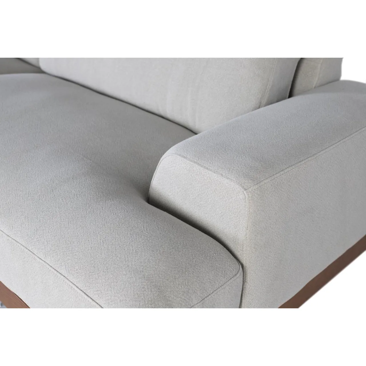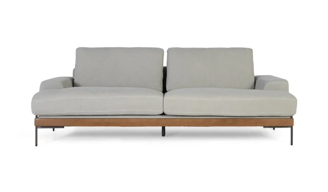 Eleva tu salón con este sofá de 3 plazas de diseño contemporáneo, tapizado en tela de lino gris claro. La madera de fresno de la estructura aporta durabilidad y una calidez natural, mientras las patas de metal envejecido crean un contraste sofisticado para un ambiente actual.