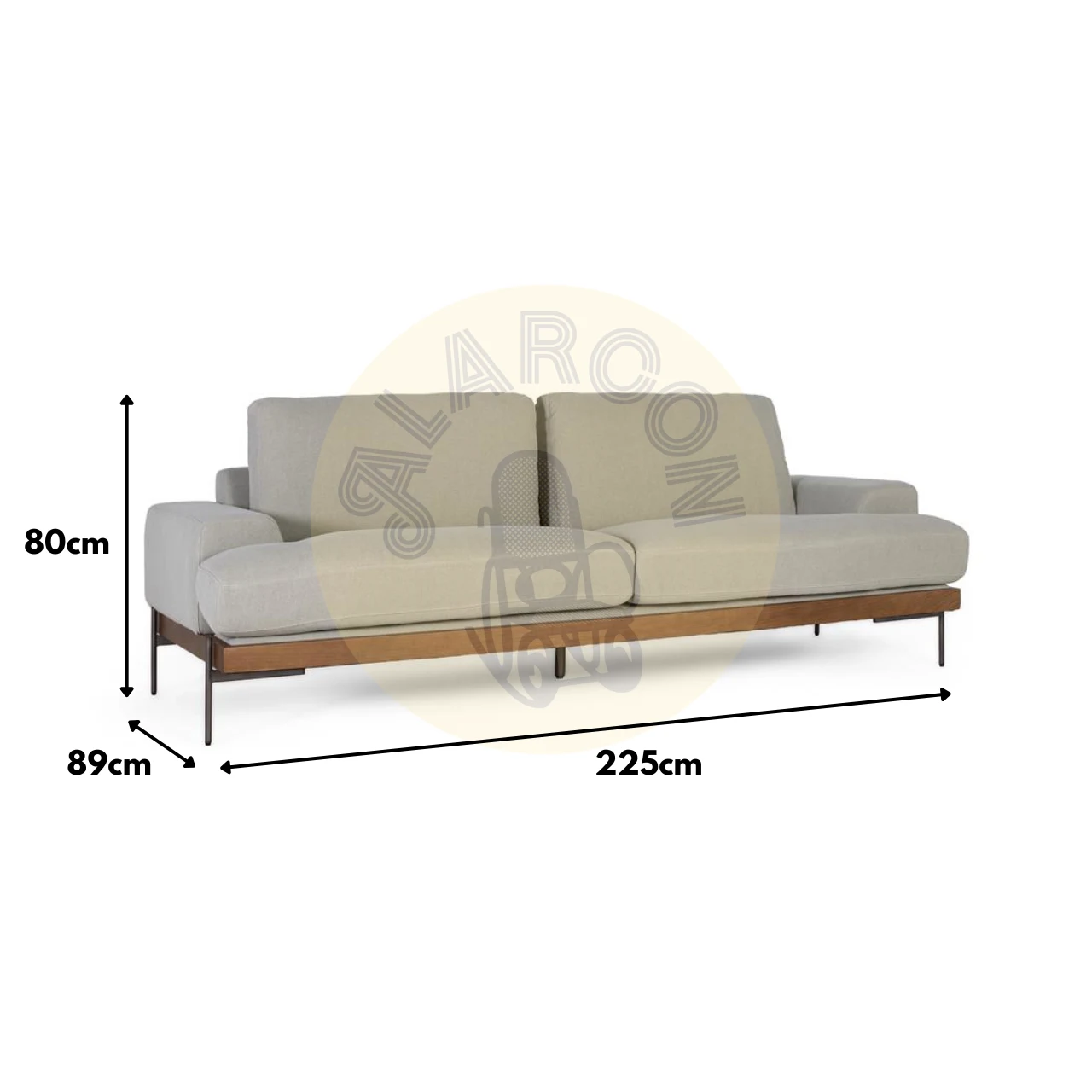 Medidas: Alto: 80 cm, Largo: 225 cm, Ancho: 89 cm; Peso: 82 kg. Relleno de espuma de poliuretano, embalaje 92×232×54 cm y requiere montaje.
