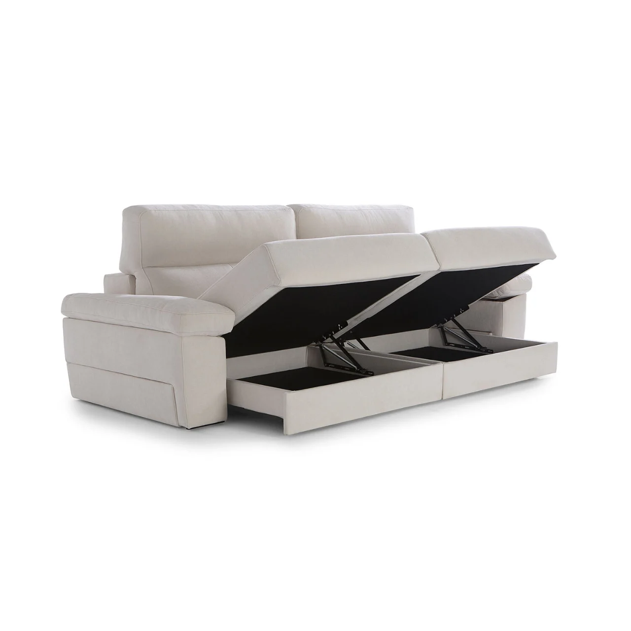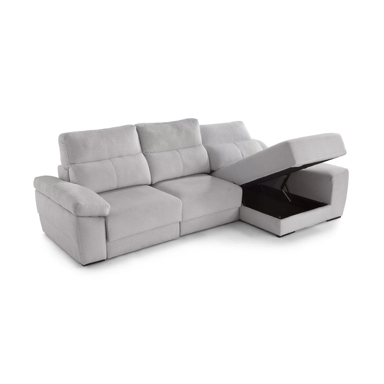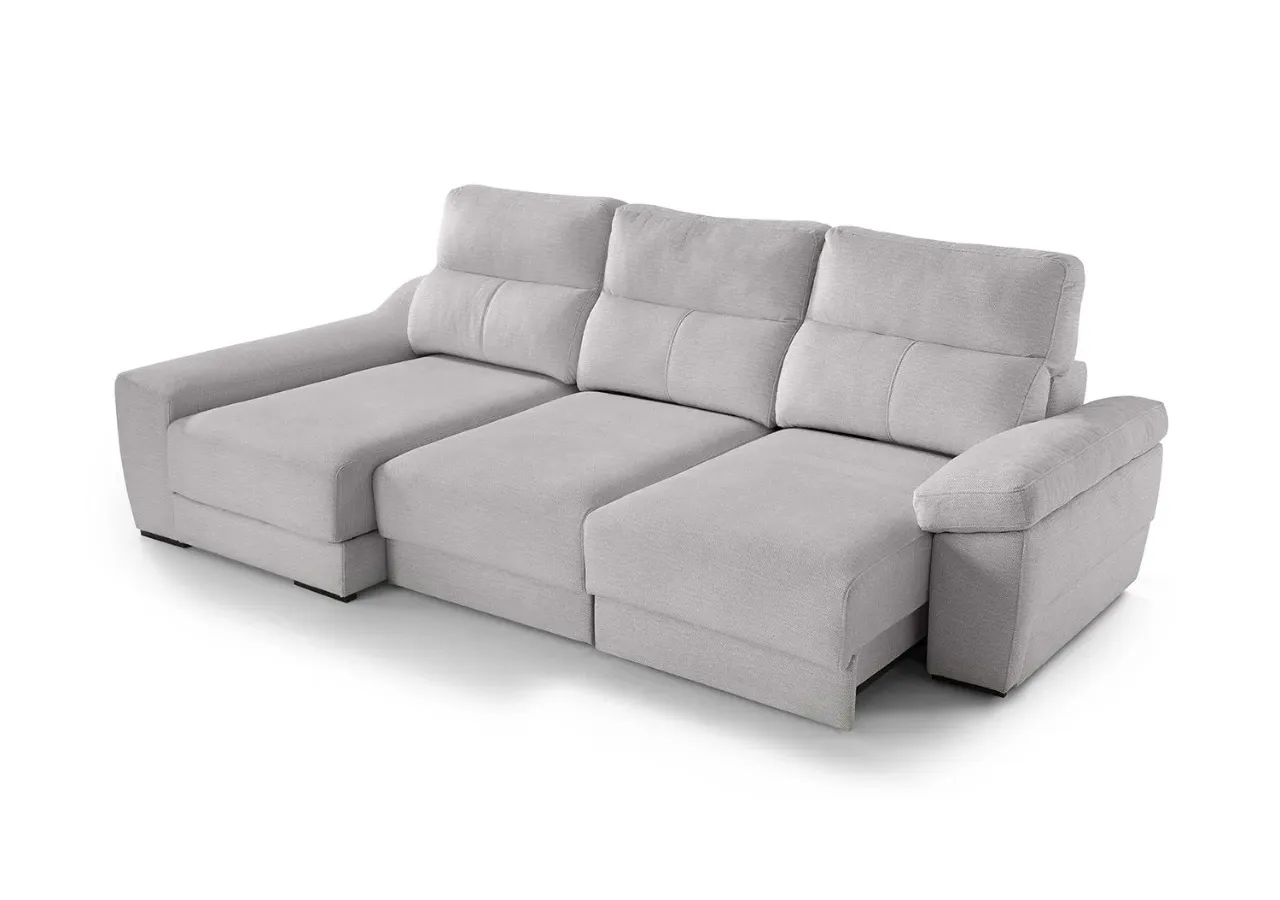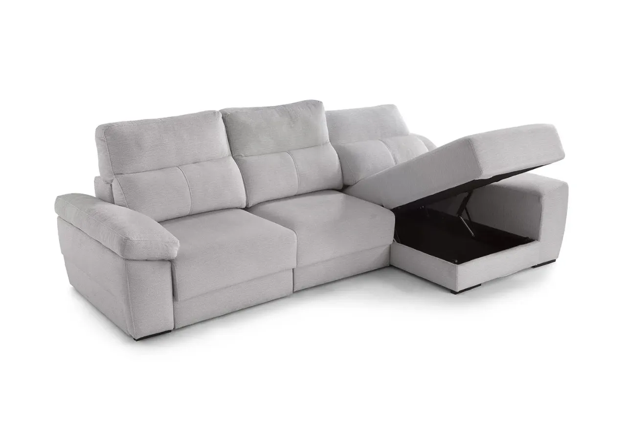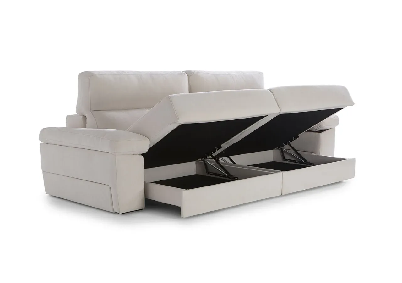 Disfruta de un uso versátil gracias a su mecanismo deslizante punto a punto, su arcón integrado y el módulo de chaise longue con salida de +32 cm, perfecto para adaptar el espacio según tus necesidades. Los respaldos reclinables de fibra hueca siliconada y los brazos con almacenamiento amplían su funcionalidad sin renunciar a una estética moderna y elegante.