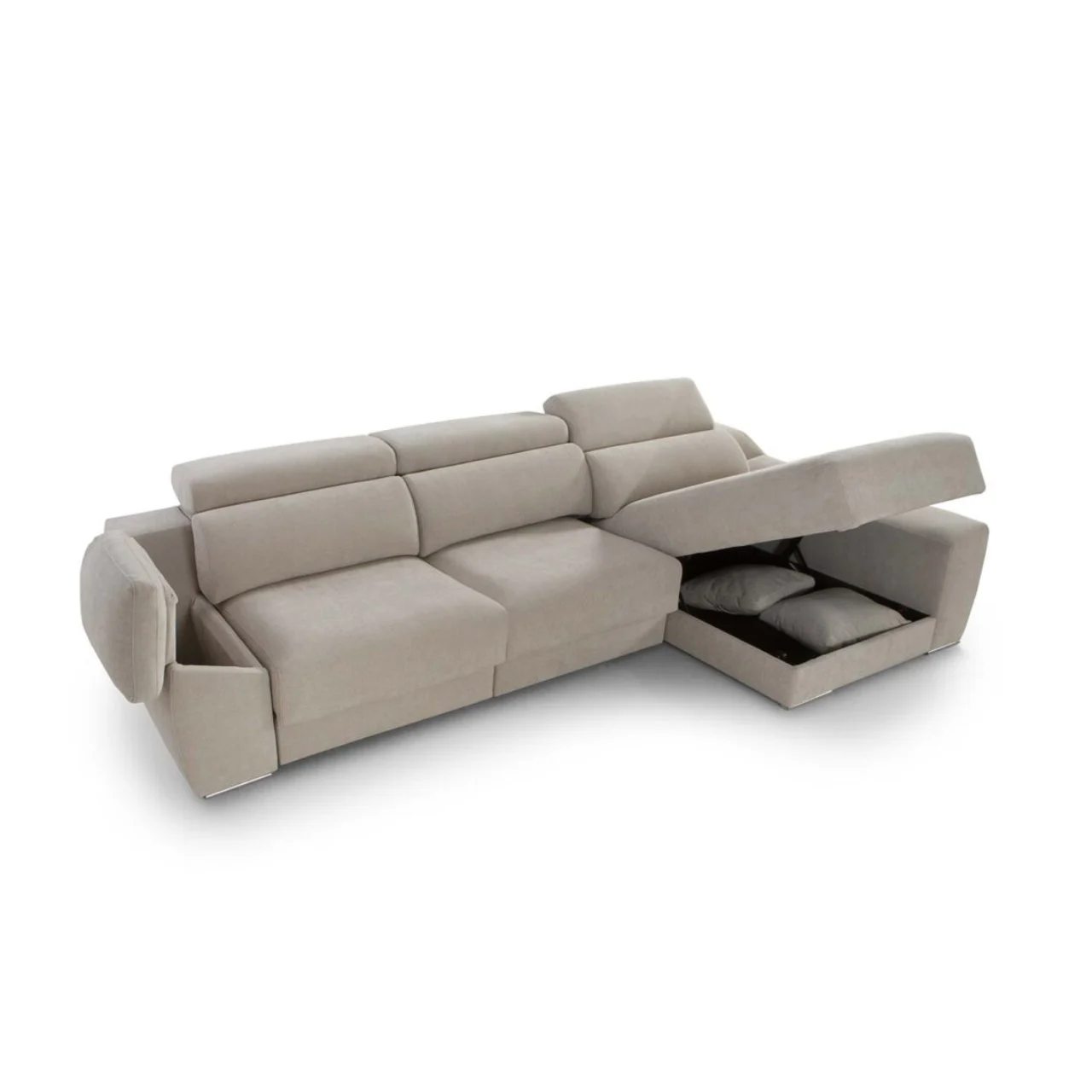 Disfruta de sus asientos con espuma de 35 kg, doble capa súper suave y mecanismo deslizante de gran prolongación, además del chaise longue deslizante manual con arcón y salida de +32 cm, pensado para momentos de descanso prolongado. Los respaldos reclinables con sistema italiano y espuma de 25 kg aportan un apoyo ergonómico que se adapta a cada postura.