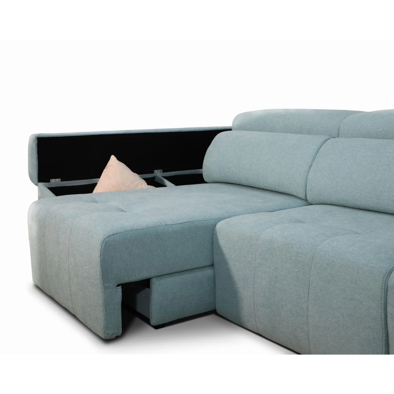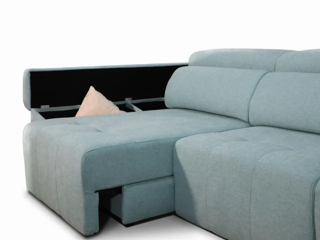 Aprovecha su chaise longue motorizada, controlada con mando a distancia, perfecta para ampliar el espacio de relajación con un deslizamiento extra de +43 cm. Los brazos deslizantes y con arcón añaden funcionalidad sin sacrificar estilo, junto con las patas de madera wengué que completan su estética moderna.