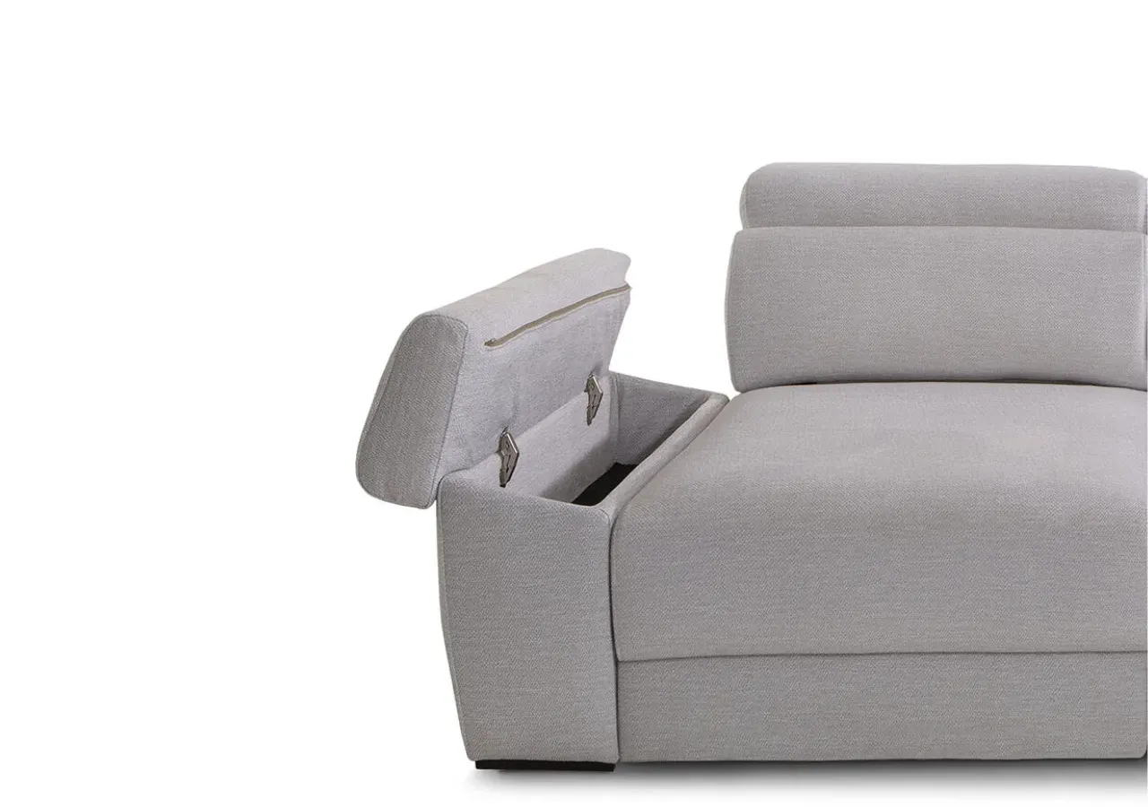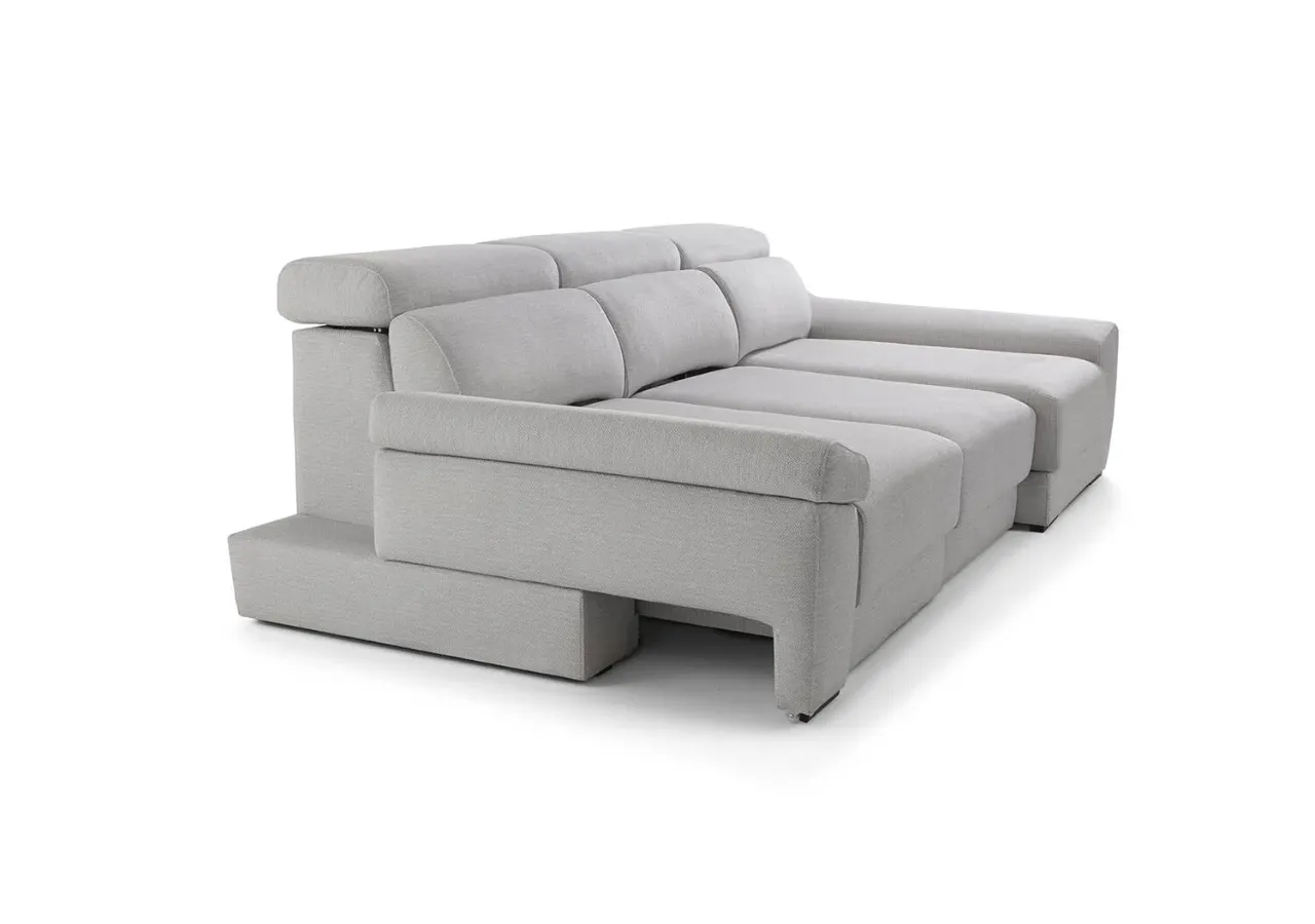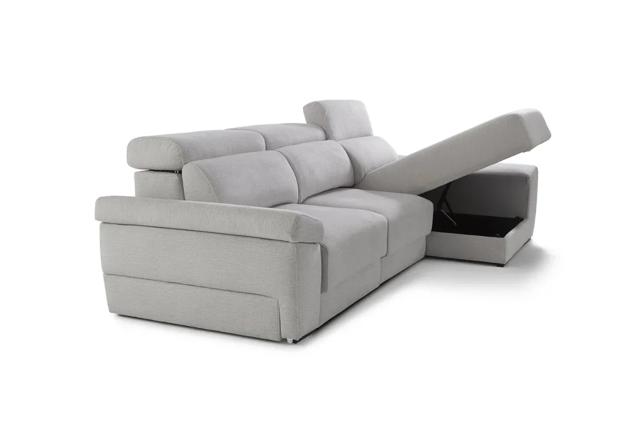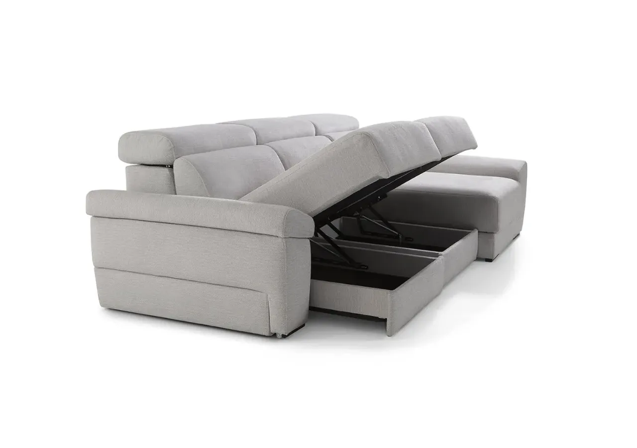 El respaldo reclinable con mecanismo italiano y la opción de asientos desenfundables aportan un uso práctico y duradero. Sus brazos incluyen un módulo deslizante con arcón de 27 cm, mientras que la chaise longue ofrece un diseño amplio con un brazo de 30 cm, perfecto para ampliar el espacio de descanso con mayor comodidad.