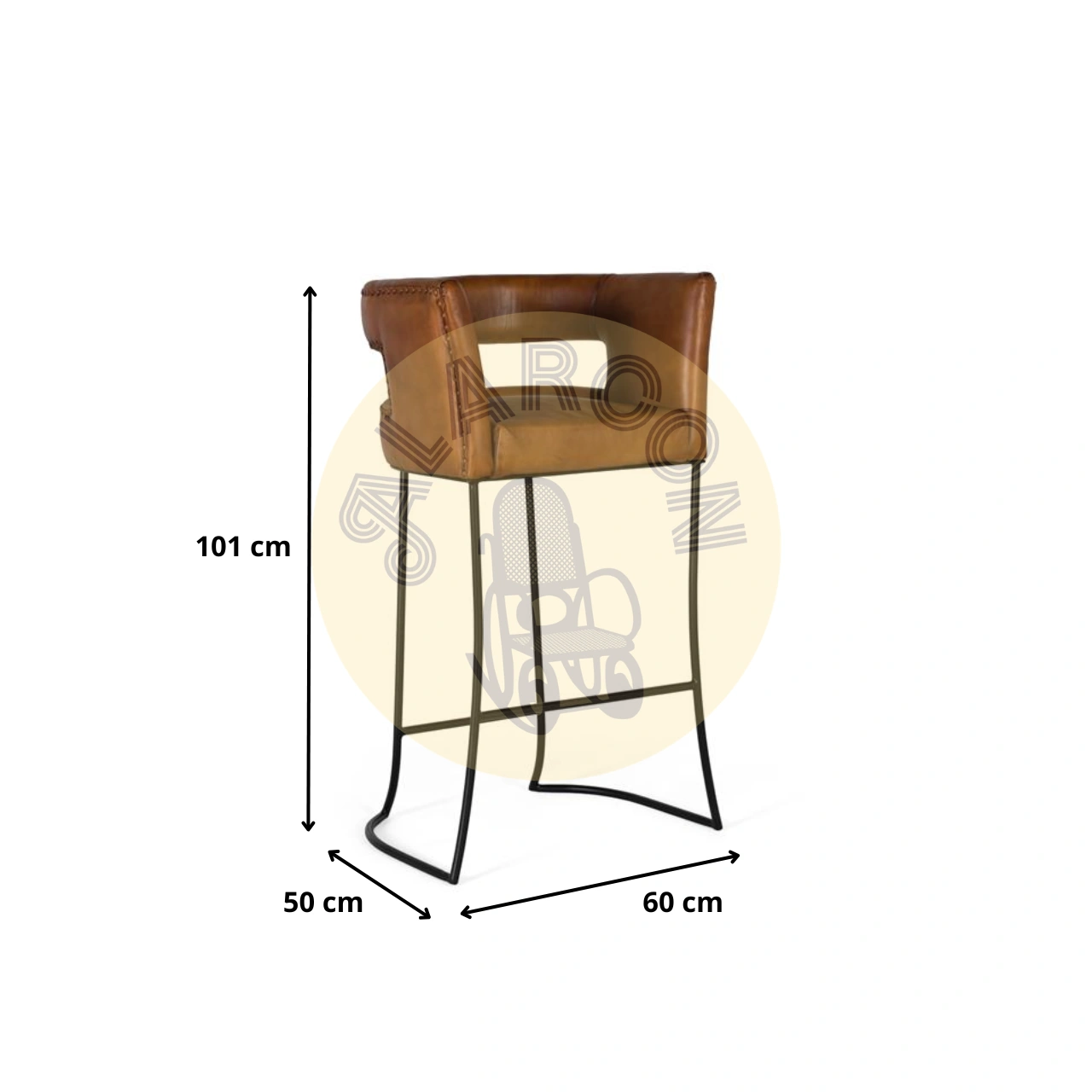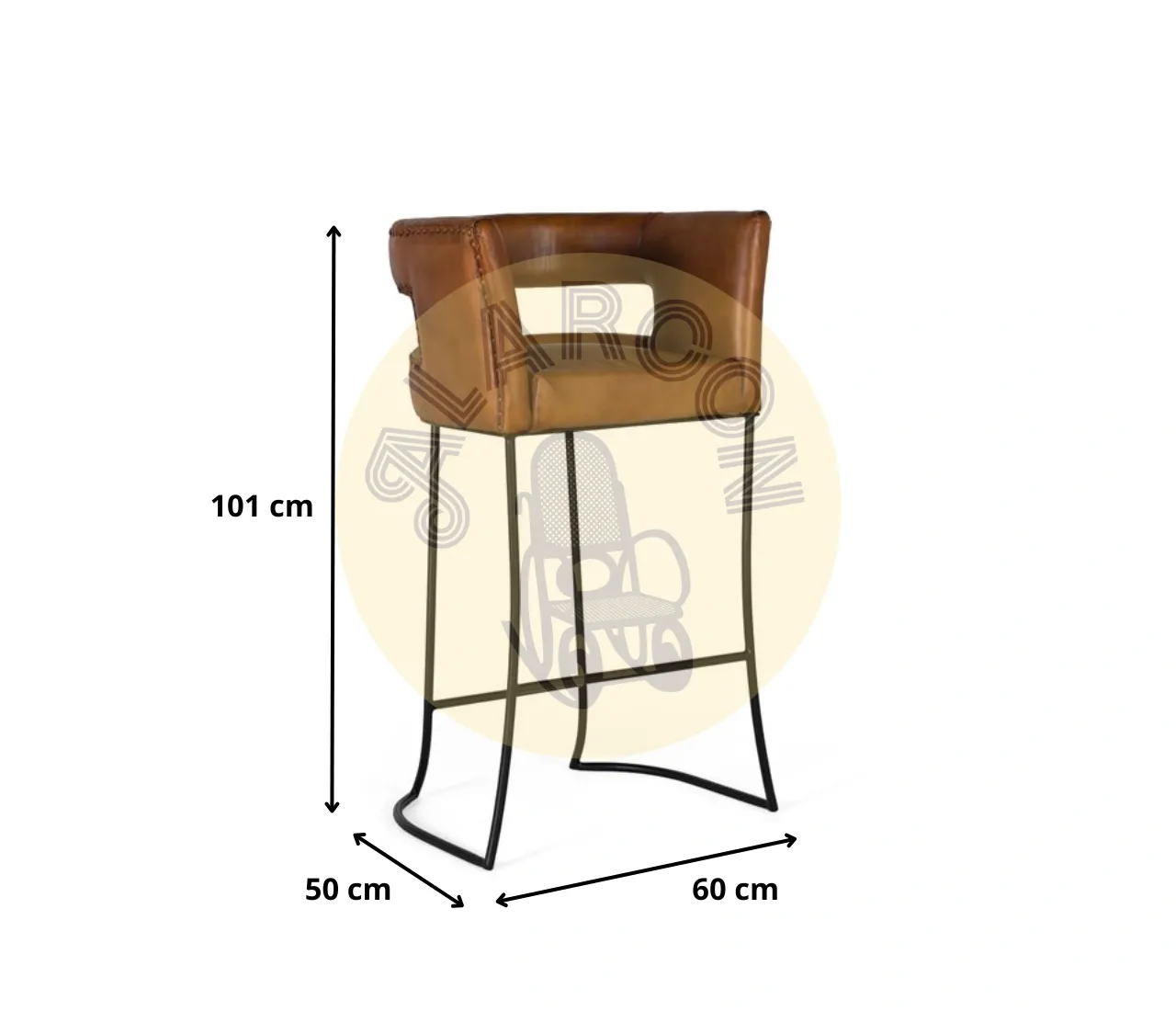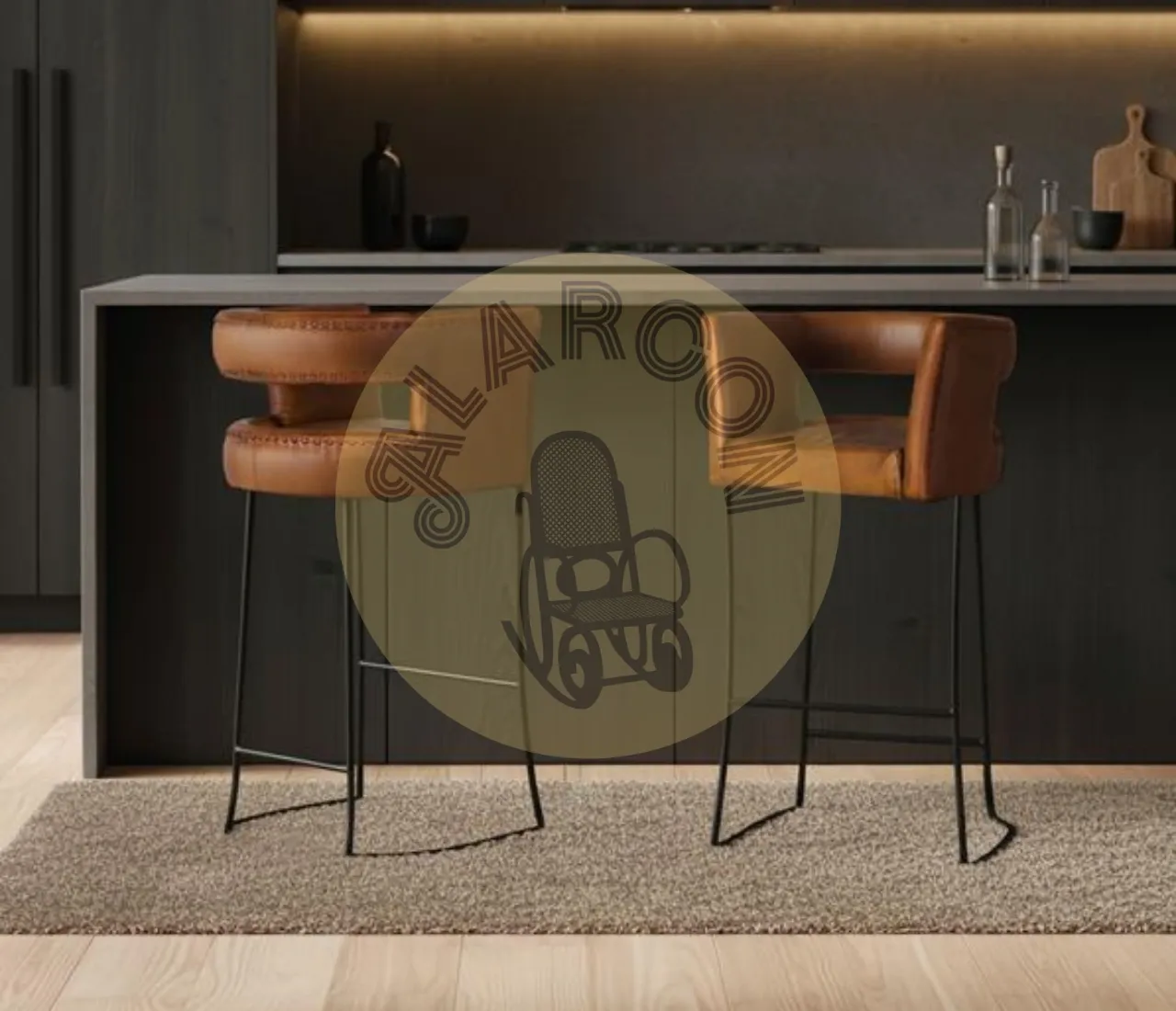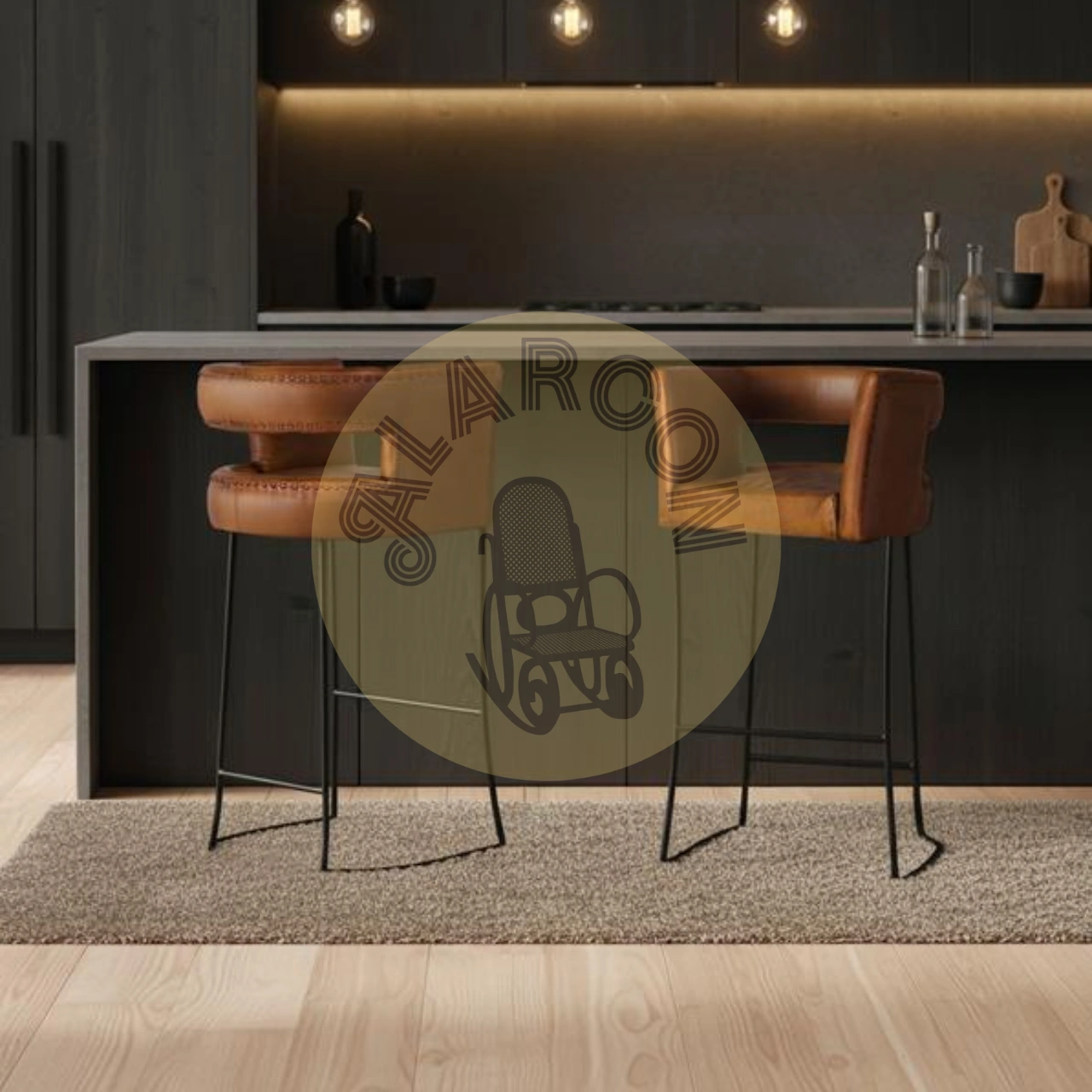 Diseñado para destacar en cocinas y barras contemporáneas, este taburete alto moderno combina piel natural color coñac con una sólida estructura de hierro negro mate, creando una pieza de estética sofisticada y gran presencia visual. Su diseño con reposabrazos y líneas limpias aporta carácter decorativo y encaja con estilos modernos, industriales o minimalistas.