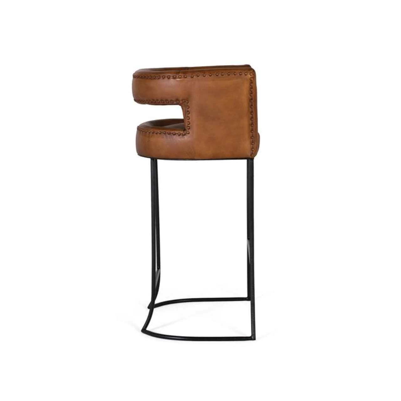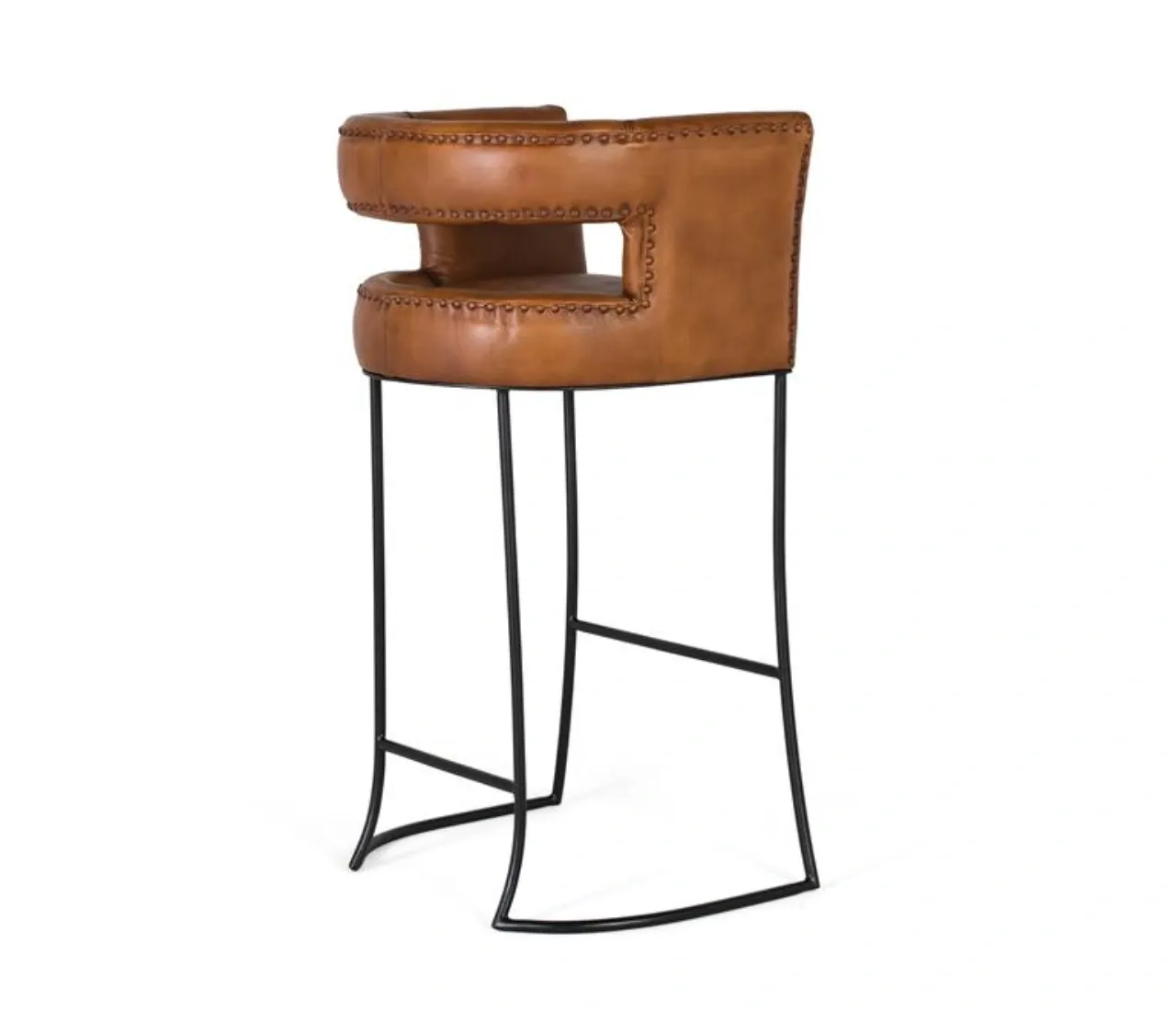 Diseño moderno y elegante: Taburete alto con piel color coñac y estructura de hierro negro mate que aporta estilo sofisticado a cocinas, barras e islas contemporáneas.