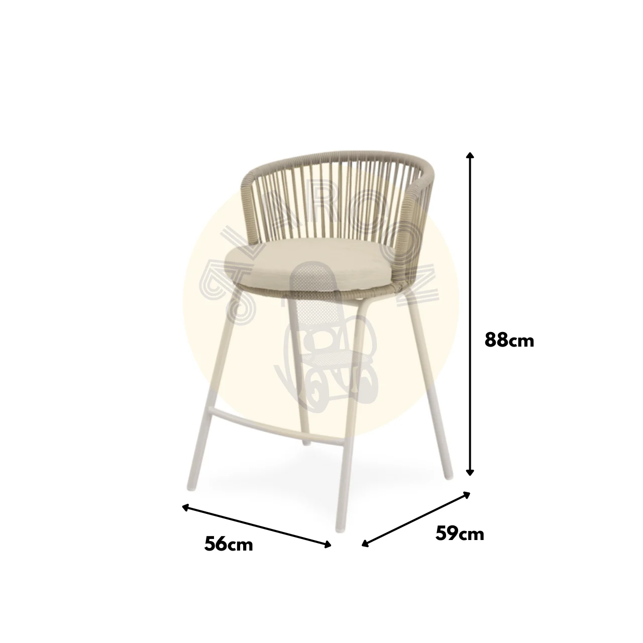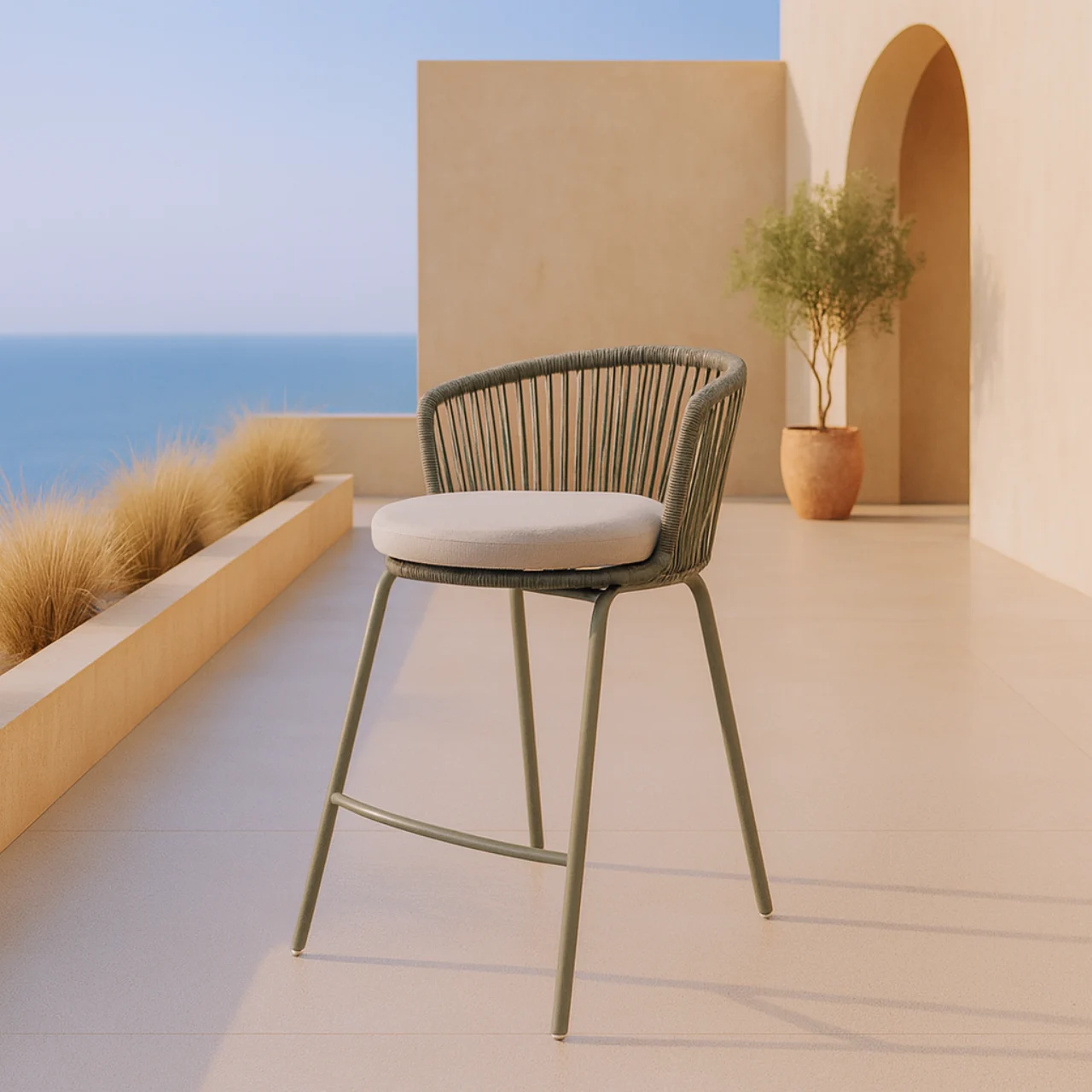 El taburete de exterior PIERRE combina un diseño contemporáneo con comodidad, integrando un respaldo curvo en cuerda resistente que envuelve suavemente la espalda y aporta ventilación natural en los días cálidos. Su acabado en Beige y Blanco añade calidez y frescura a cualquier espacio exterior.