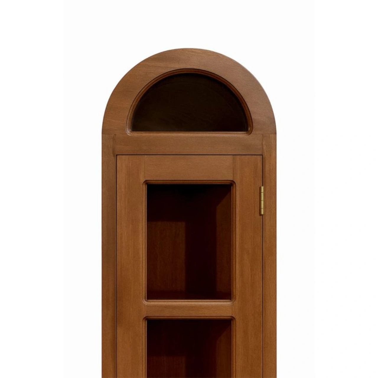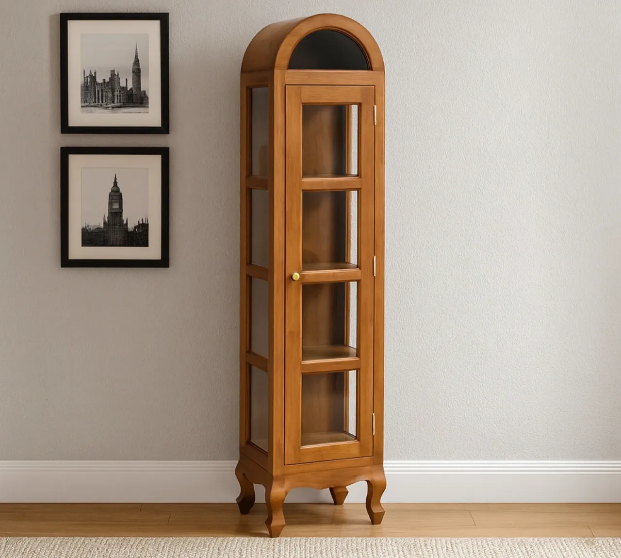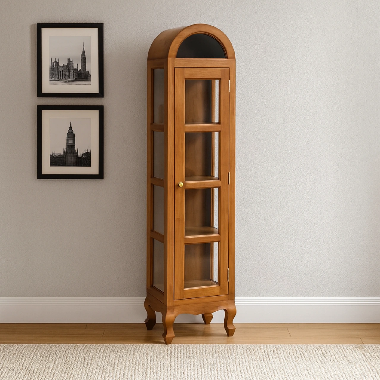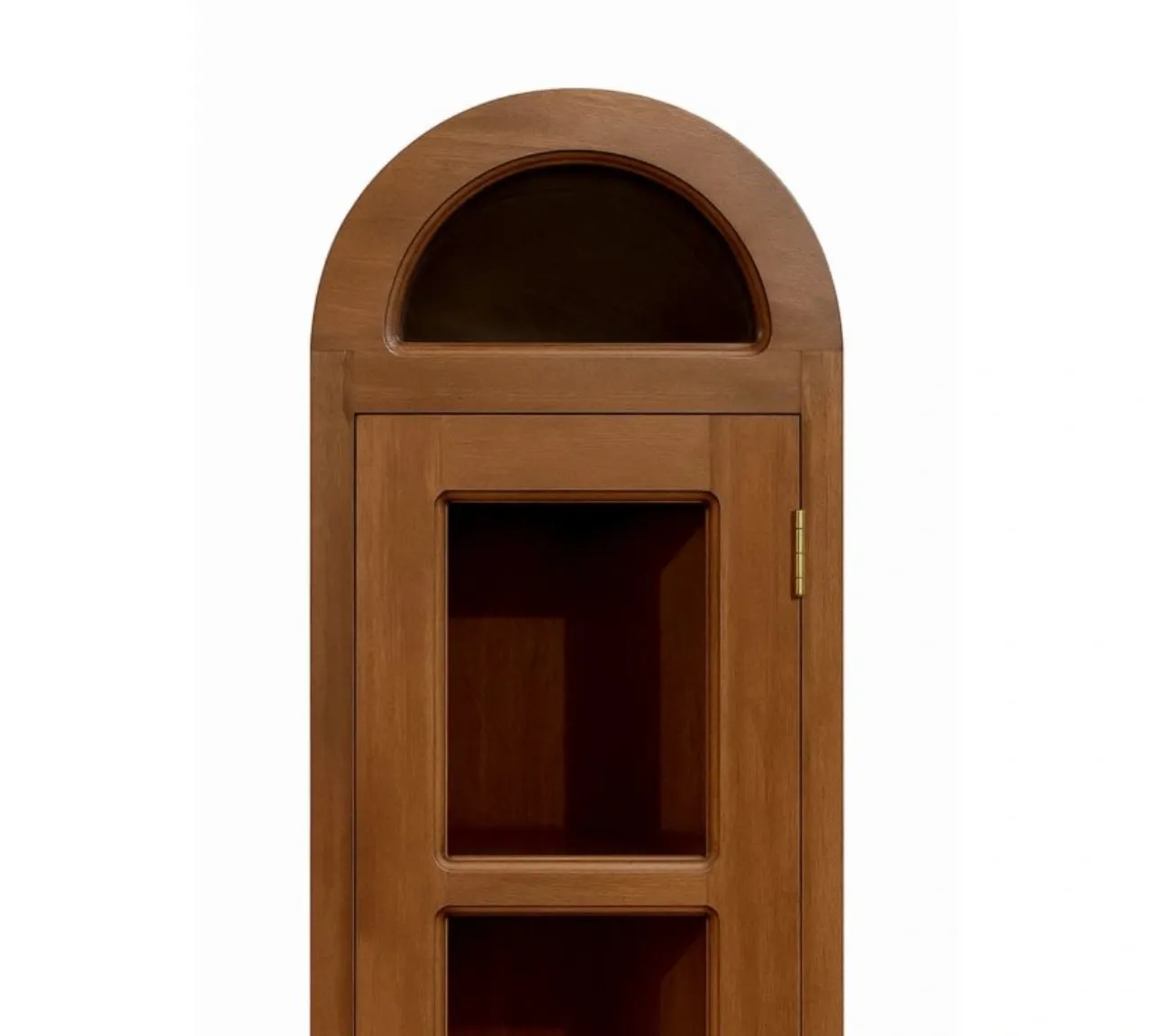 Eleva la decoración con esta vitrina auxiliar de madera maciza de caoba, un material valorado por su resistencia, su textura natural y su estética cálida. Su diseño estilizado realza la verticalidad y aporta un aire atemporal ideal para salones, comedores o pasillos.