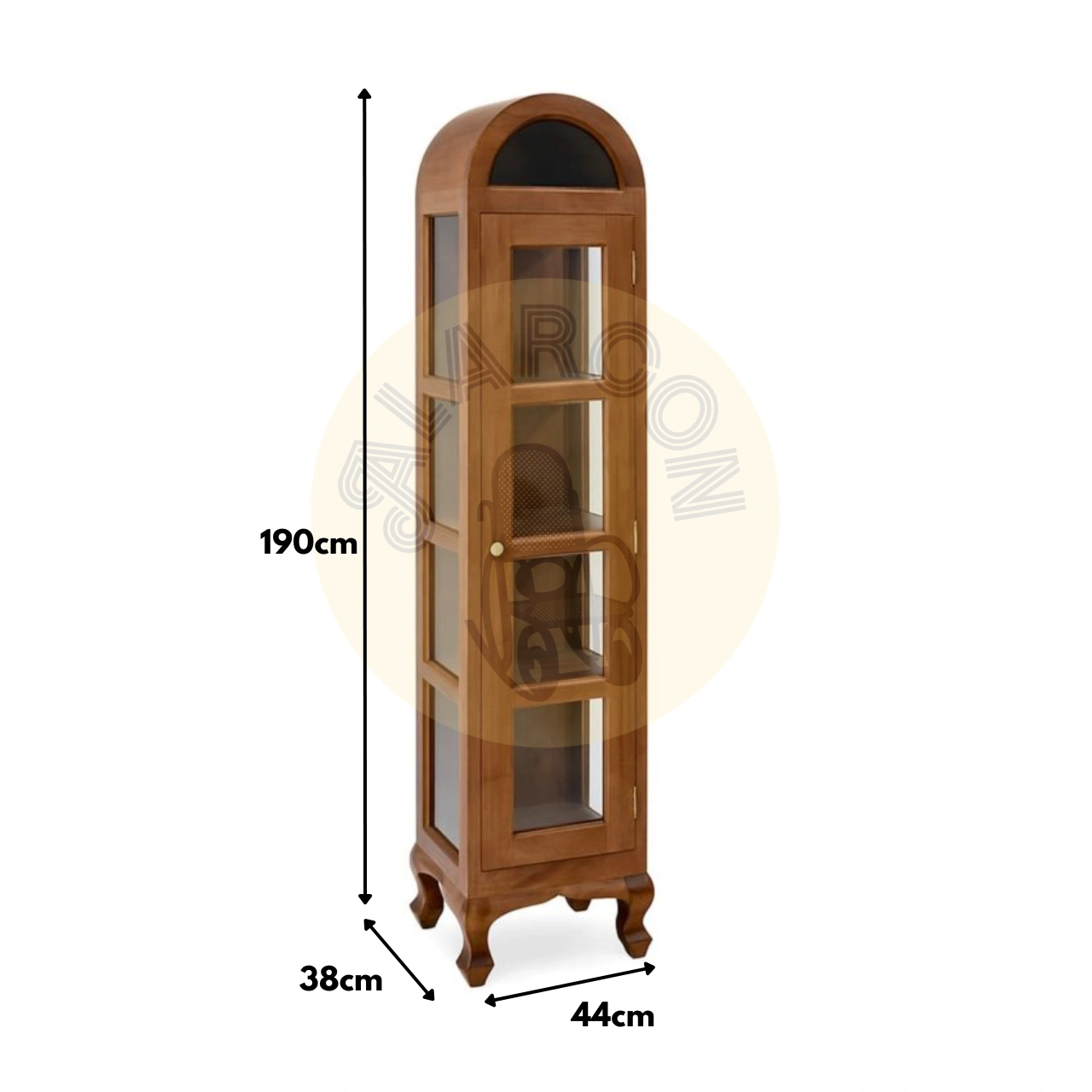 Con unas medidas de 44 × 38 × 190 cm, incorpora cuatro estantes que ofrecen un espacio accesible y organizado para exponer objetos decorativos, libros o piezas personales. La estructura firme y el acabado artesanal refuerzan la estabilidad y aportan un acabado de gran calidad.