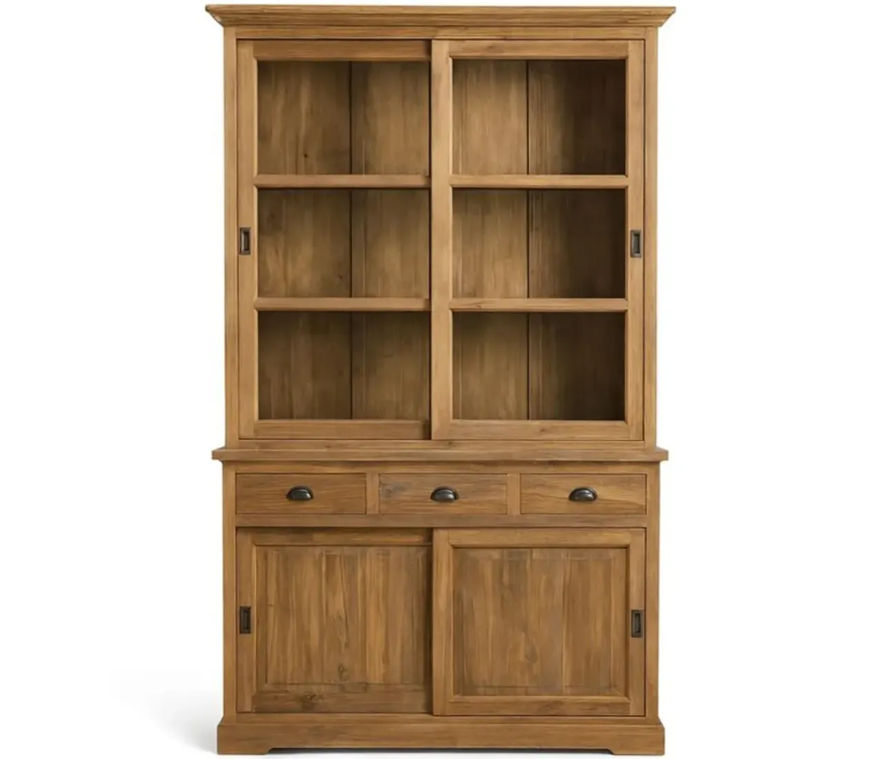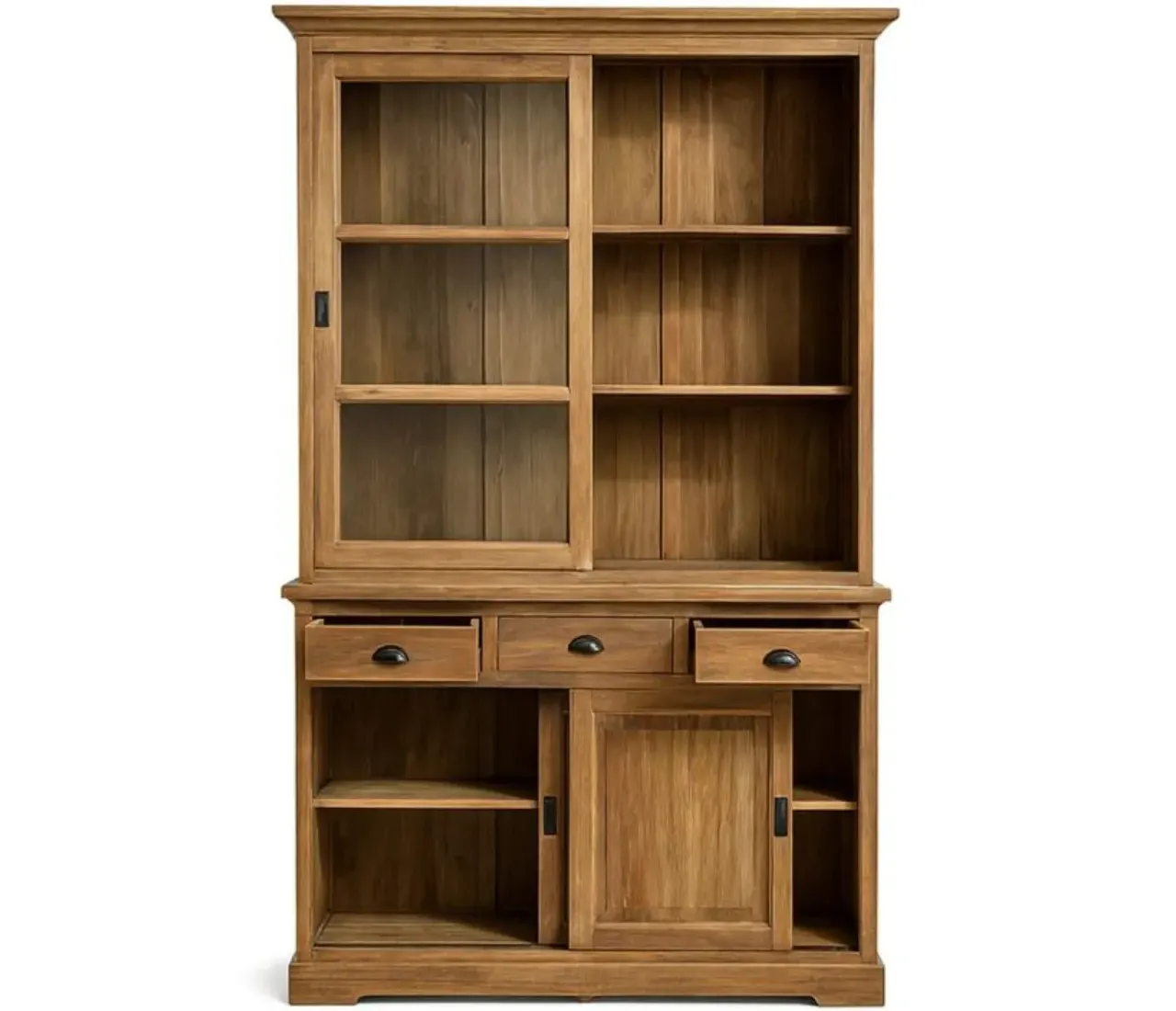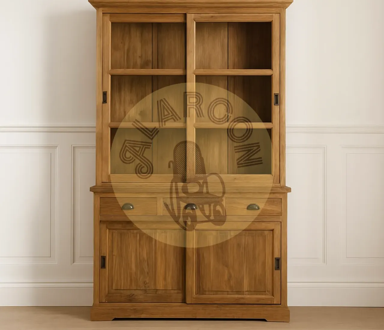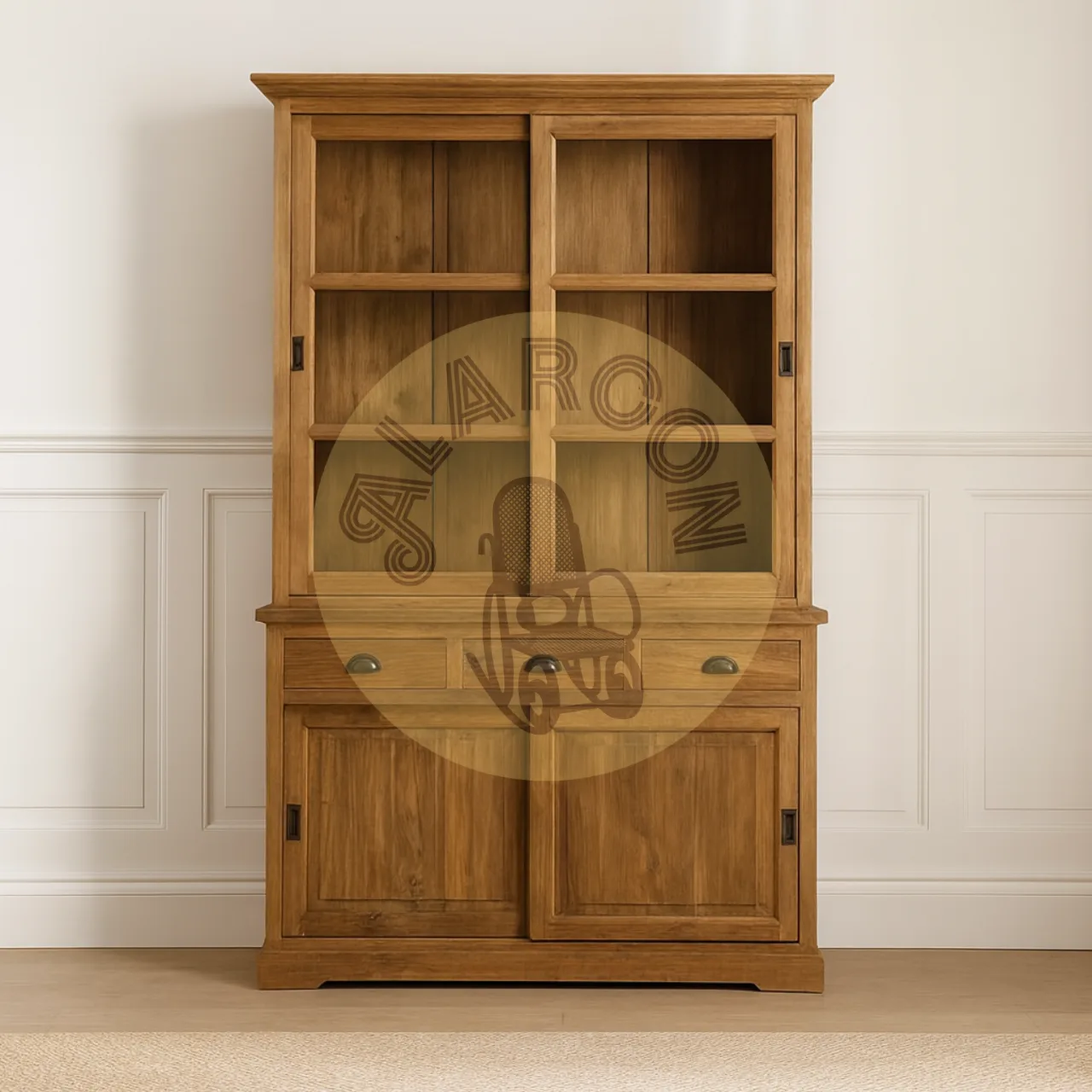 Elige la vitrina de madera de teca maciza para dar un toque natural y auténtico a tu espacio. Su diseño artesanal hecho a mano convierte cada pieza en un mueble único, con acabados que destacan la calidez y la textura natural de la madera.