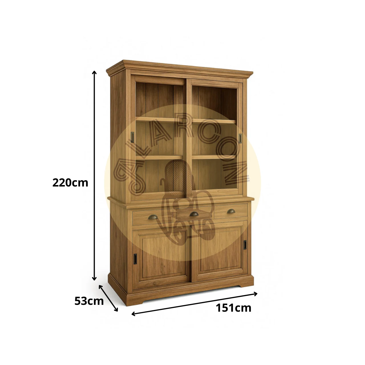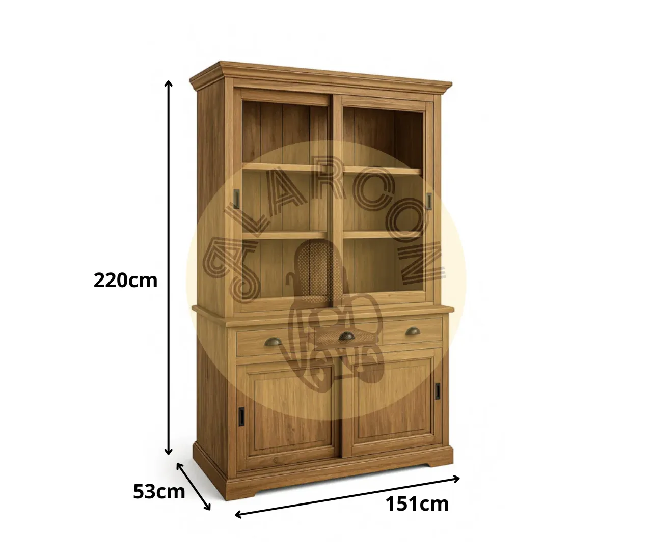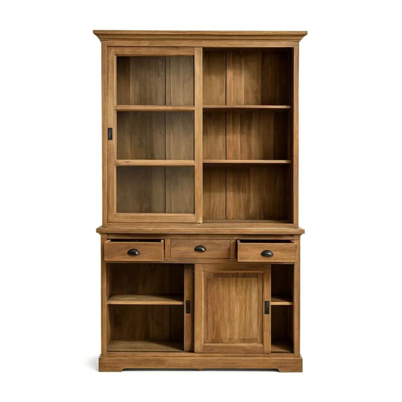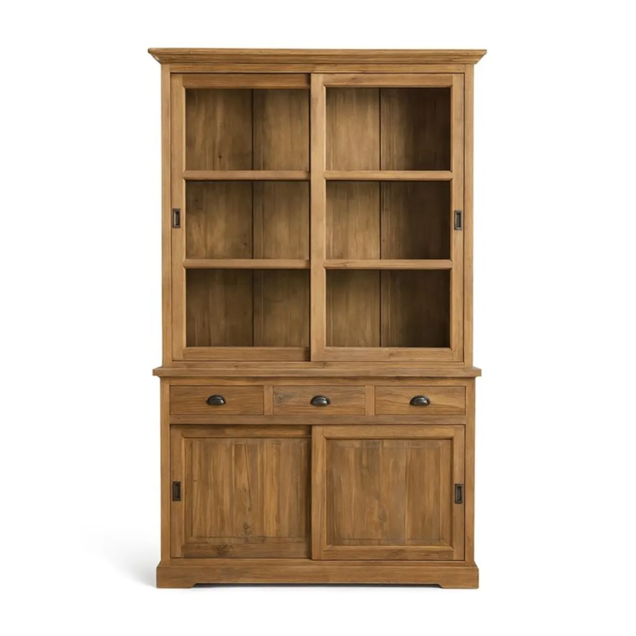 Elige la vitrina de madera de teca maciza para dar un toque natural y auténtico a tu espacio. Su diseño artesanal hecho a mano convierte cada pieza en un mueble único, con acabados que destacan la calidez y la textura natural de la madera.