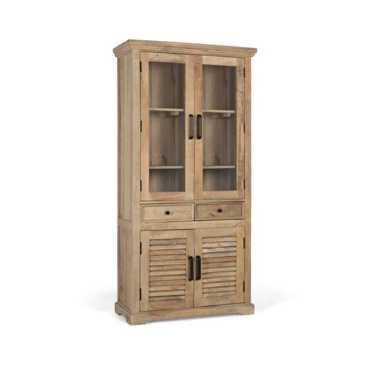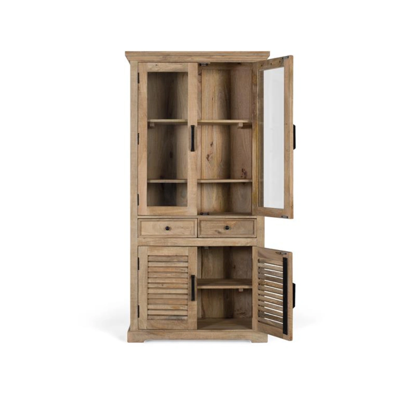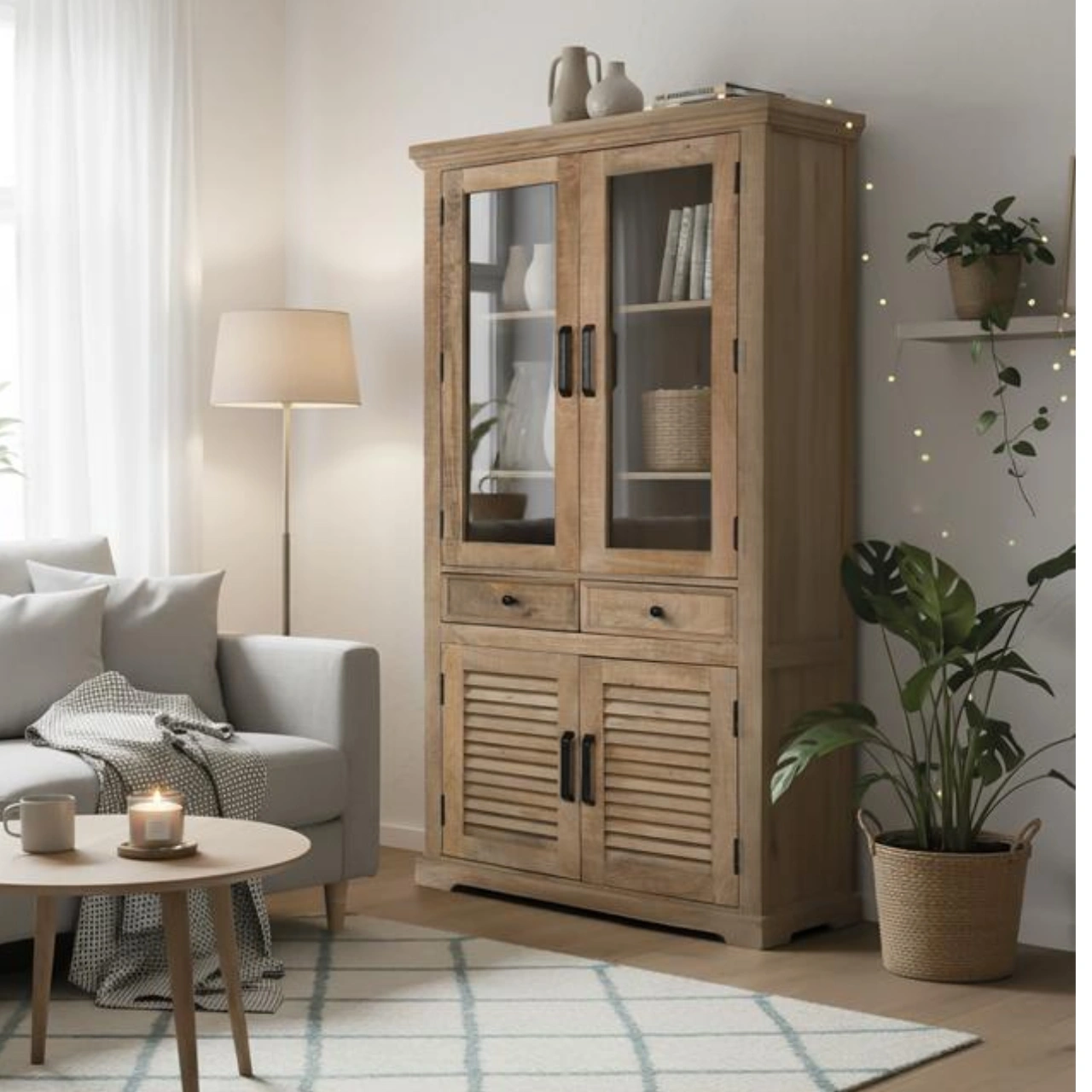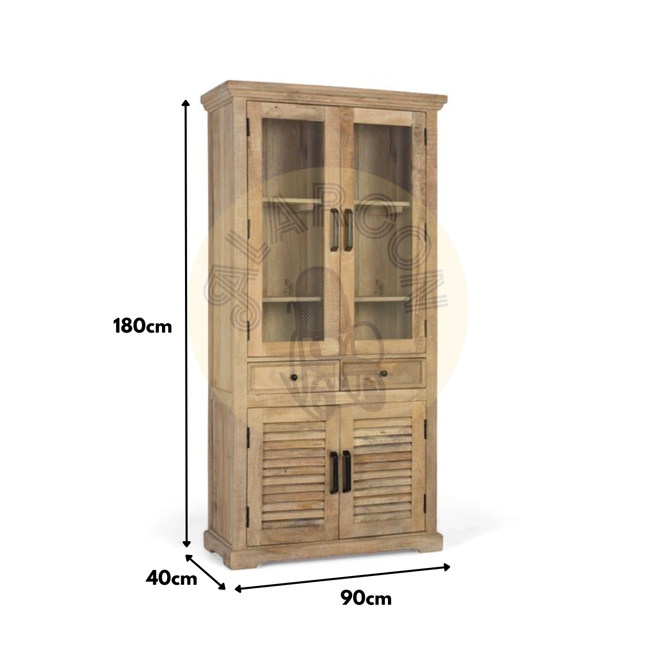 Realza tu espacio con esta vitrina de madera maciza de mango, acabada en color natural para destacar sus vetas y aportar calidez a cualquier ambiente. Su diseño combina robustez, estética actual y un equilibrio perfecto entre exposición y almacenaje.