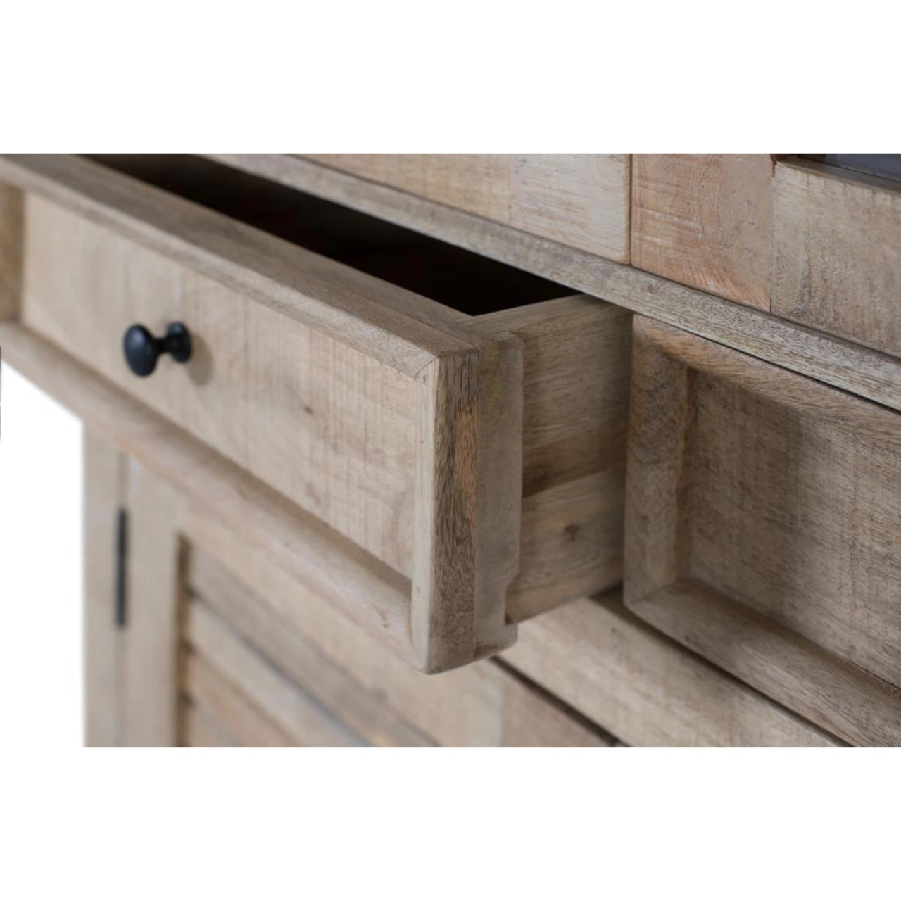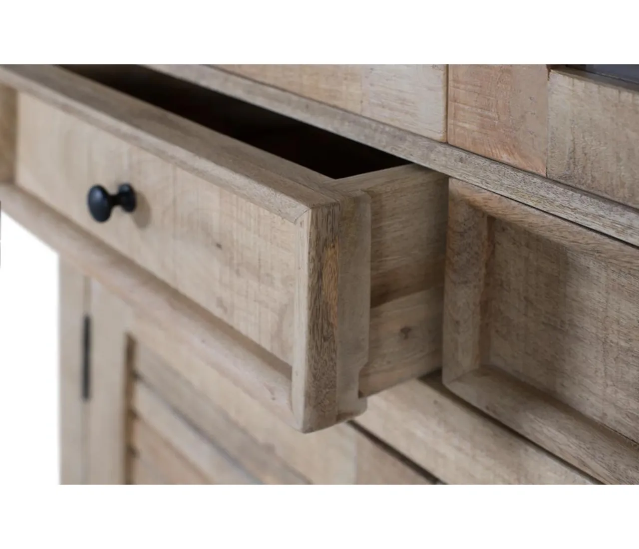 En la parte superior, las puertas de cristal permiten lucir decoración o vajilla con visibilidad y protección. La zona intermedia incorpora dos cajones prácticos, mientras que las puertas inferiores con lamas añaden un matiz rústico y refuerzan su personalidad.
