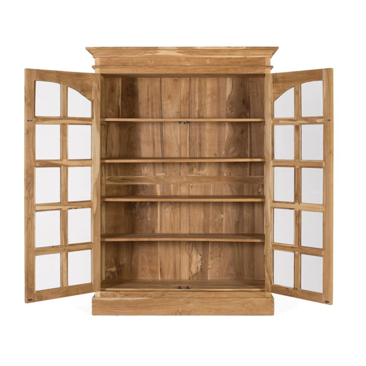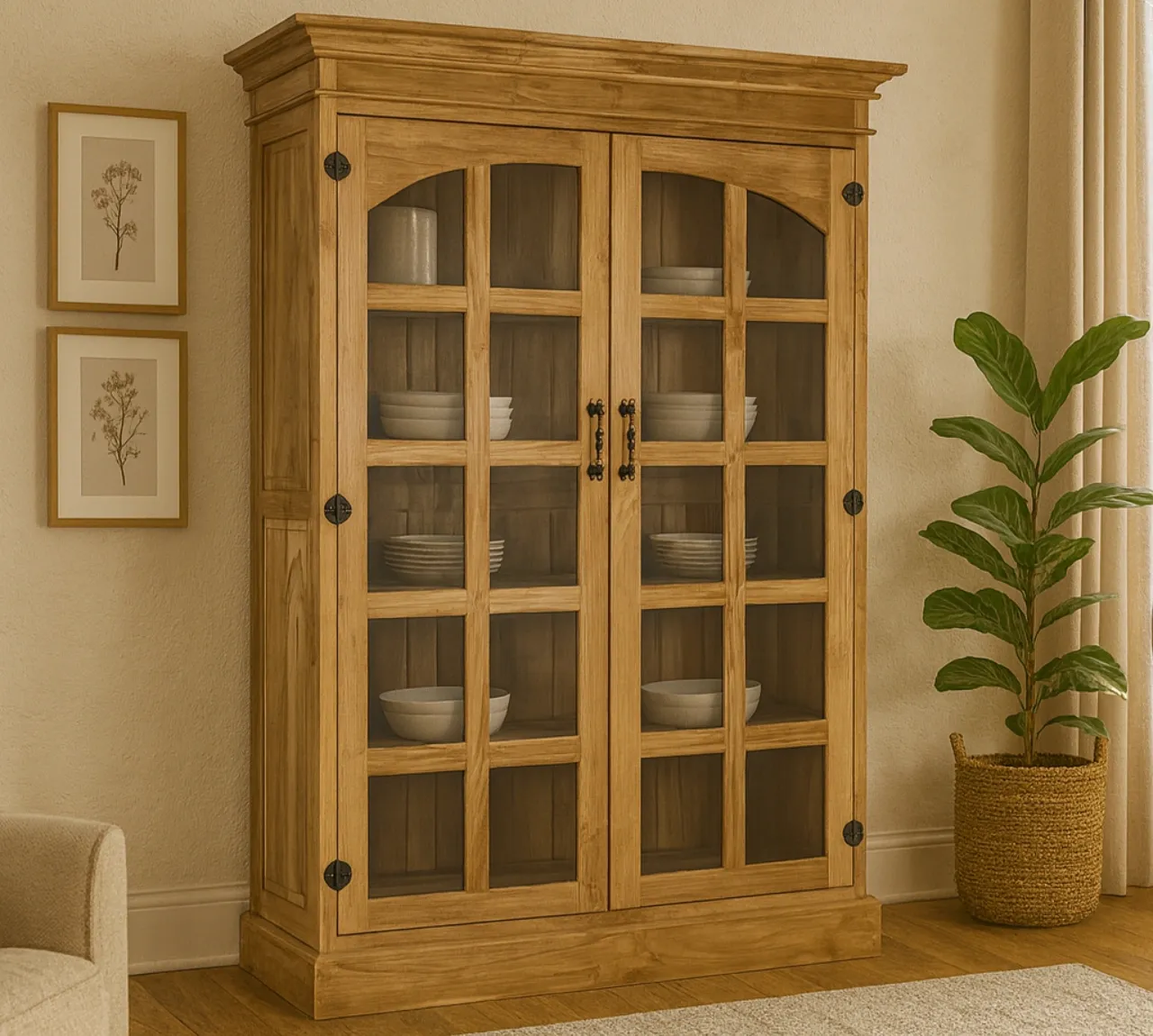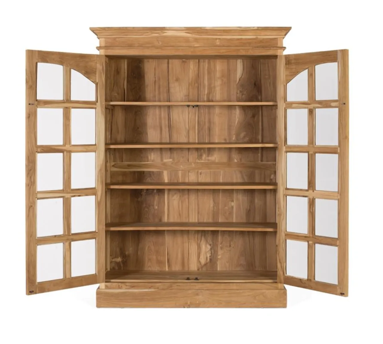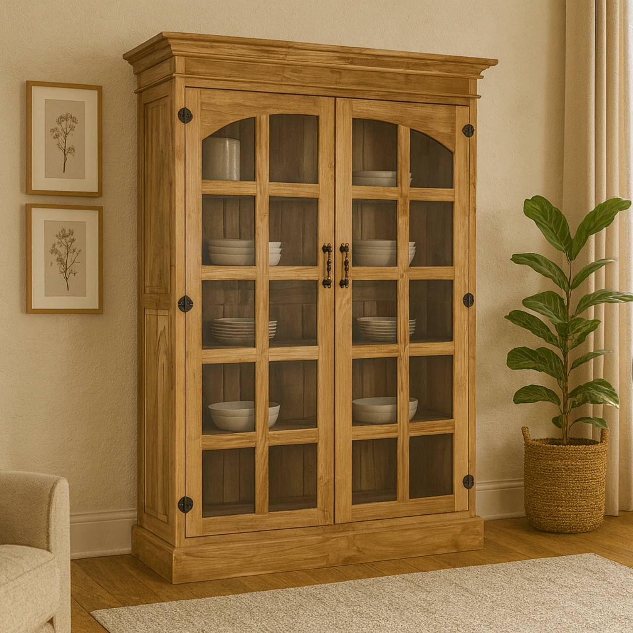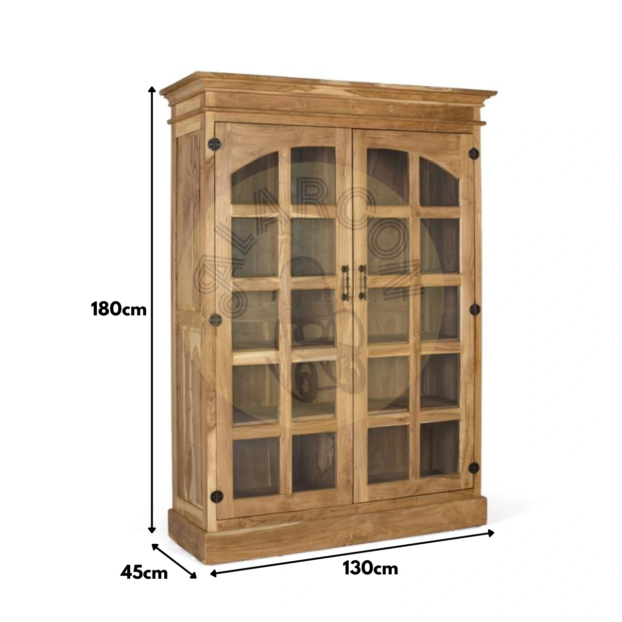 Realza tu espacio con esta vitrina de madera maciza de teca, acabada en un tono natural rústico que potencia su veta y aporta una estética cálida y atemporal. Sus puertas de cristal con cuarterones enmarcados en madera destacan por su carácter clásico, mientras que los herrajes metálicos oscuros añaden contraste y un toque artesanal muy decorativo.