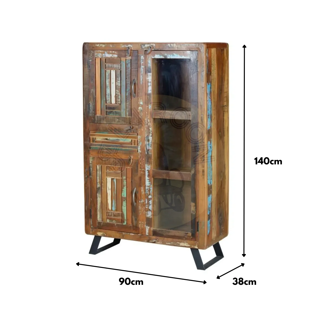 Fabricación Artesanal Robusta: La Vitrina, hecha de madera reciclada, garantiza resistencia y durabilidad ideales para un uso a largo plazo.